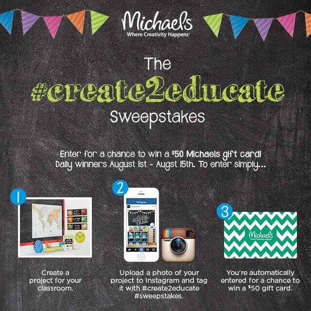 Go right now to Michaels and create your own Back-to-School project and upload it to Instagram using #Create2Educate AND #sweepstakes for a chance to win a $50 gift card to Michaels!! You have from now until August 15th to post your photos!